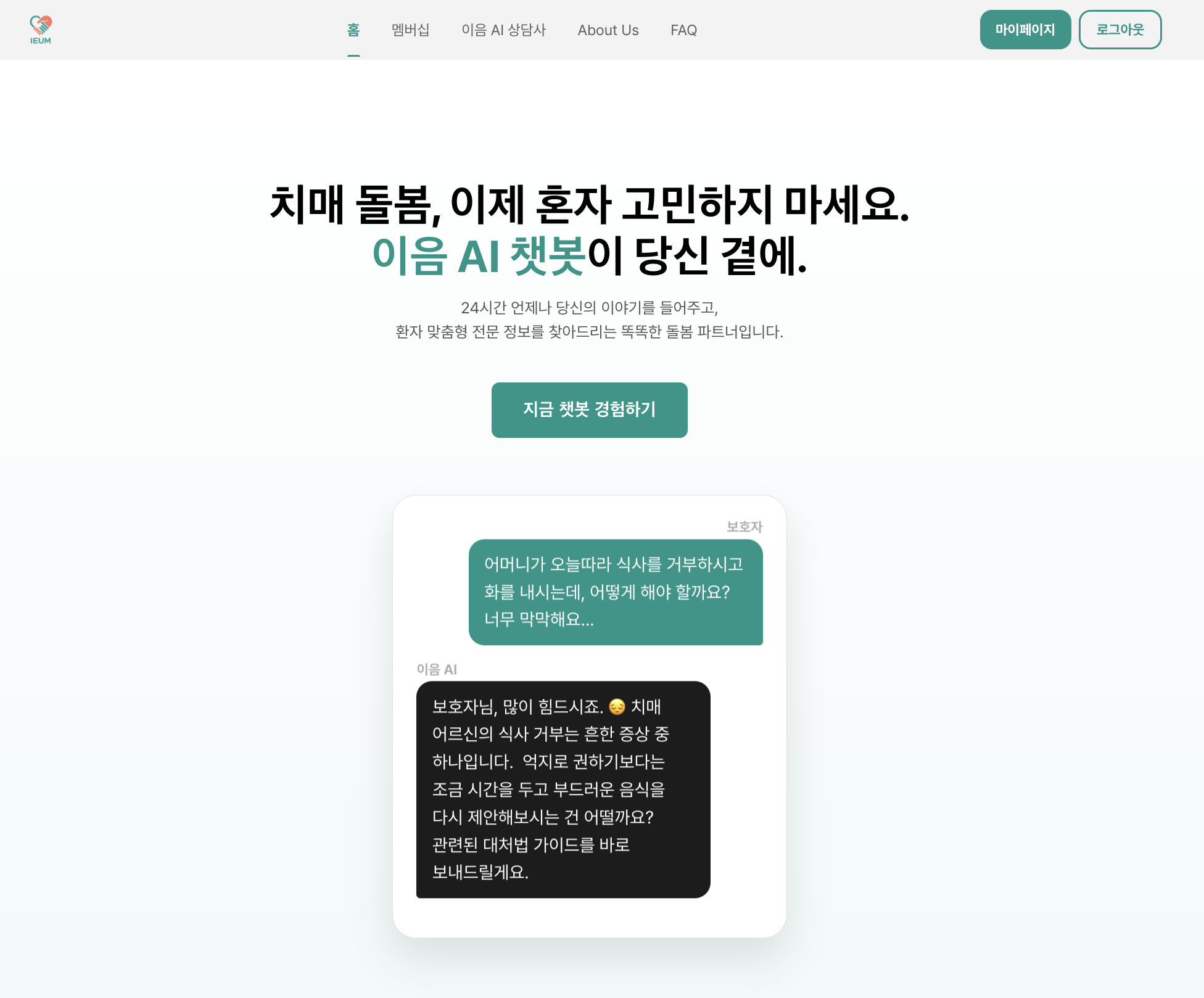 AI 챗봇 연동과 멤버십 결제를 갖춘 치매 돌봄 보호자 지원 플랫폼.